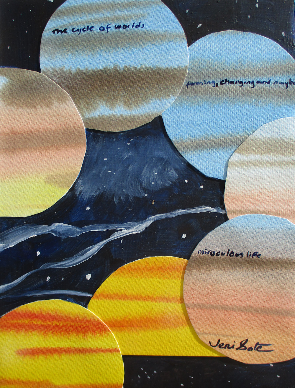 #1732 "Cycle of Worlds". Original mixed media on upcycled panel. 10x7.5". $60. The following poem is also painted into the painting: